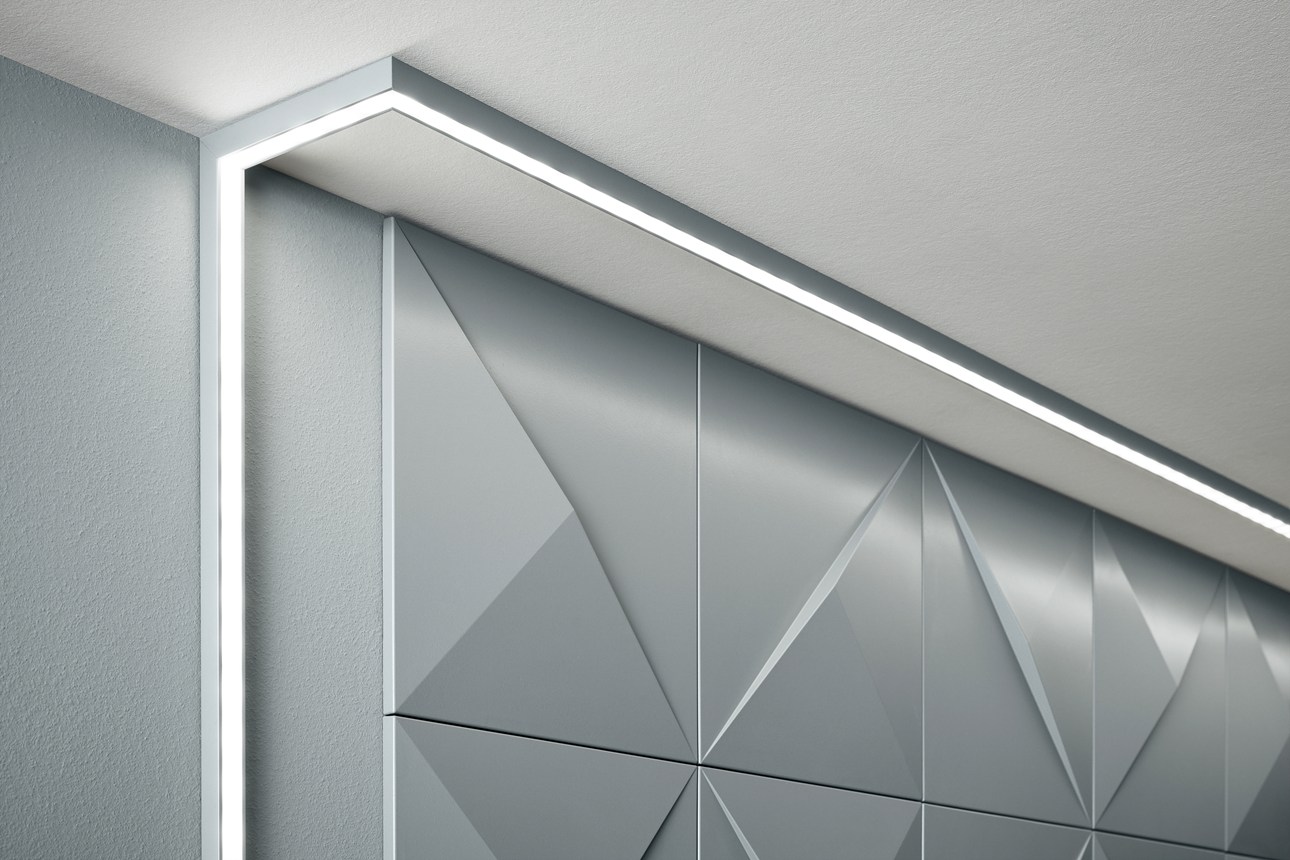 Карнизы, защитные стенные рейки, плинтусы и элементы отделки стен, сочетающиеся с прямым и непрямым освещением, –